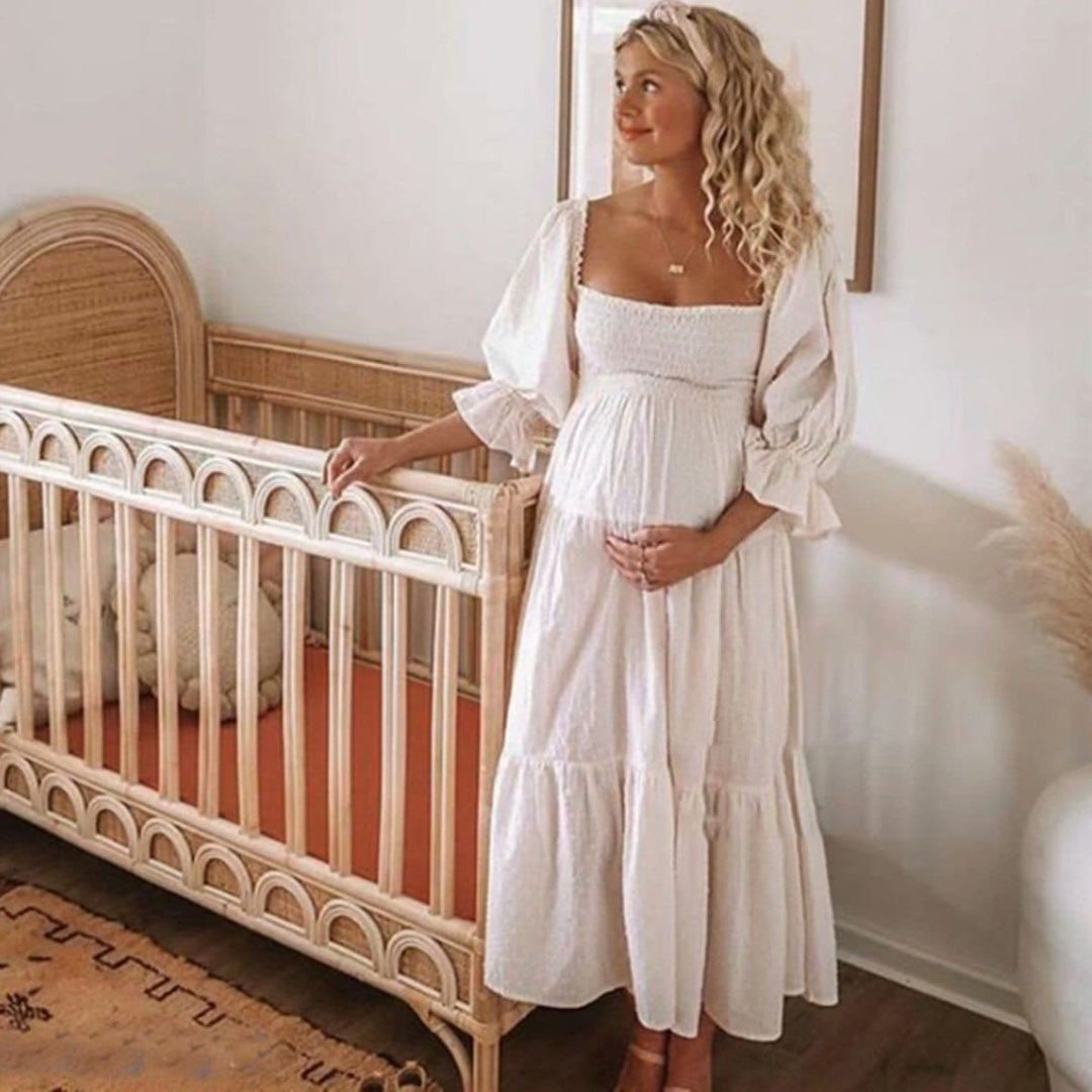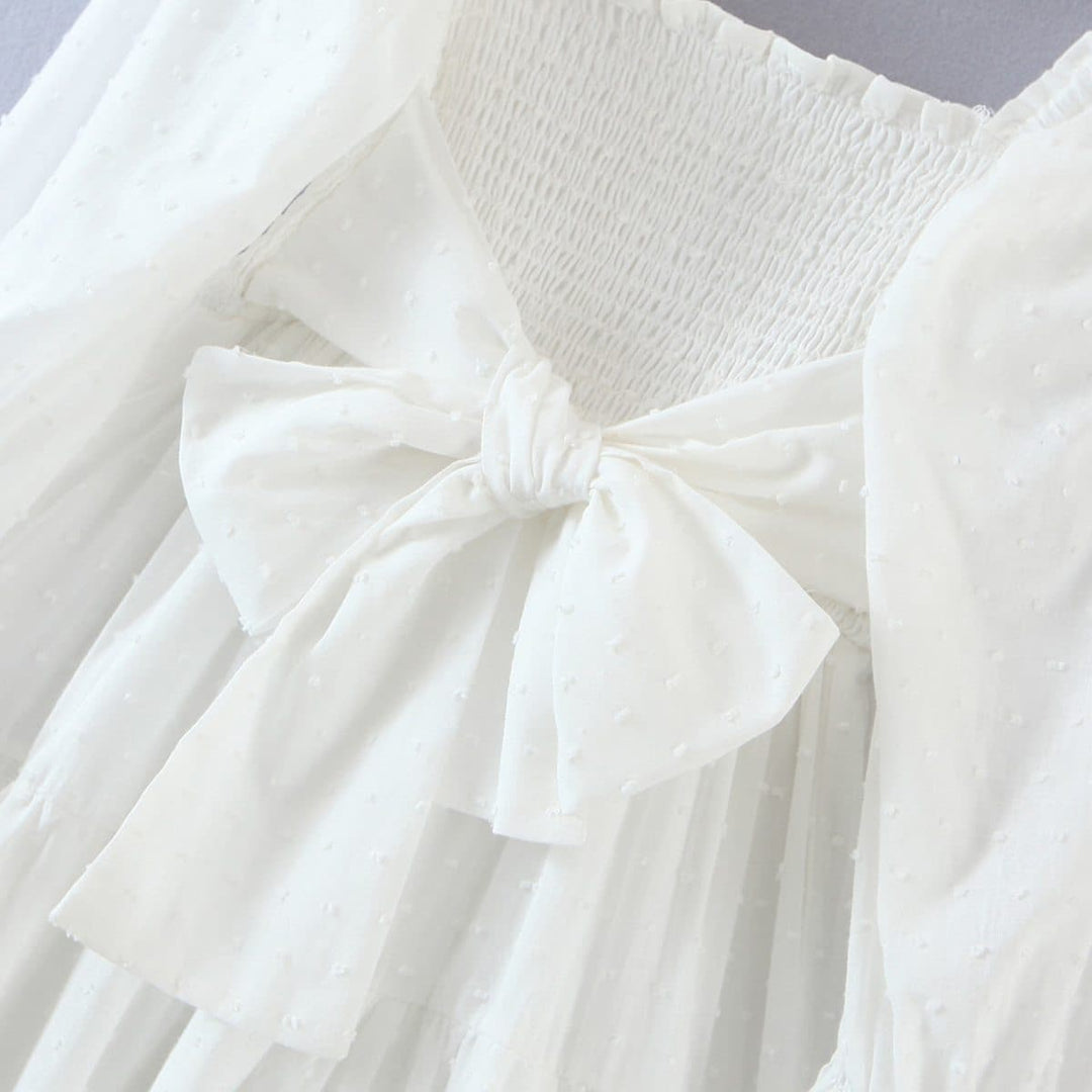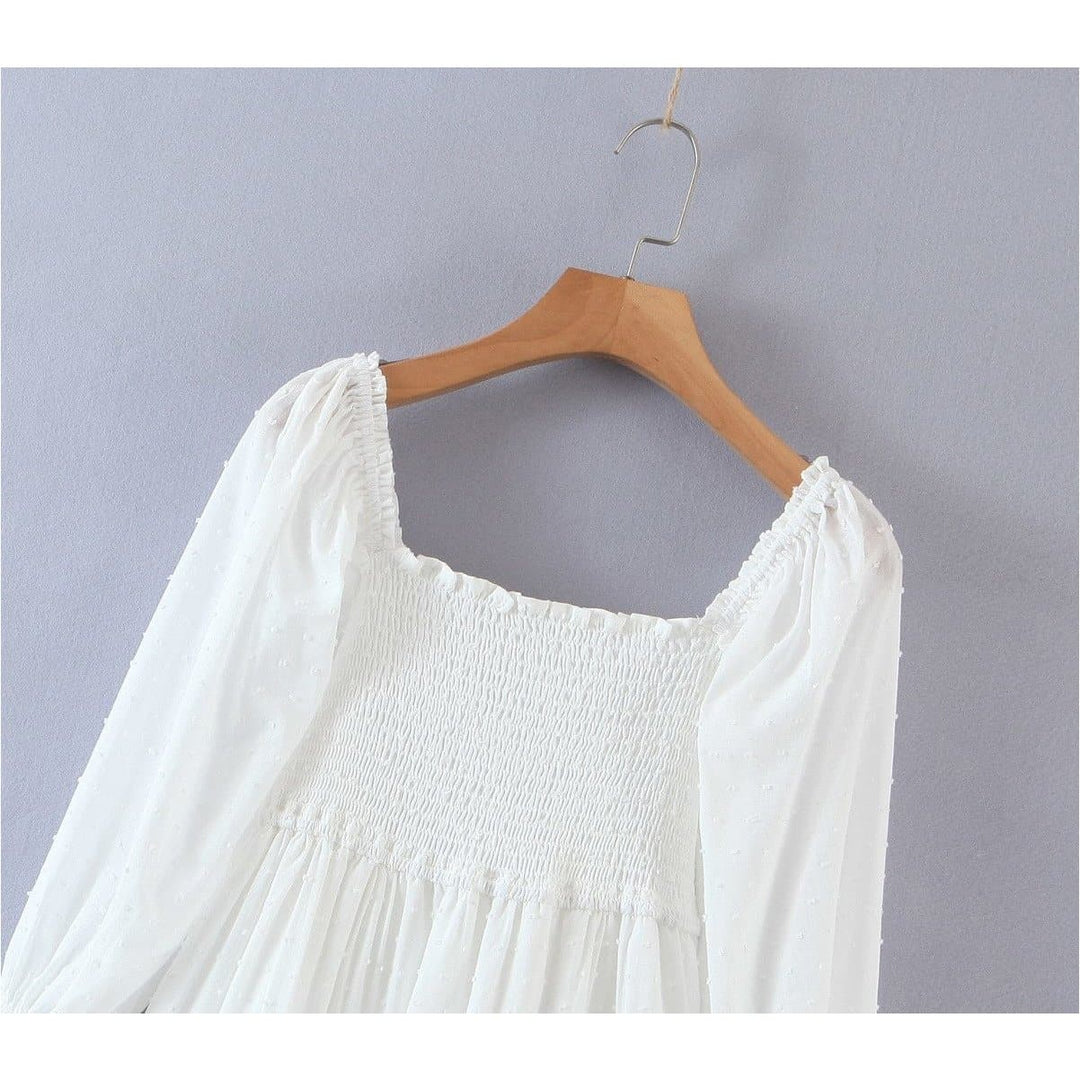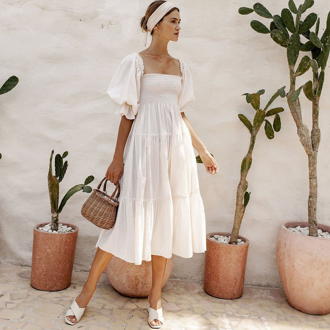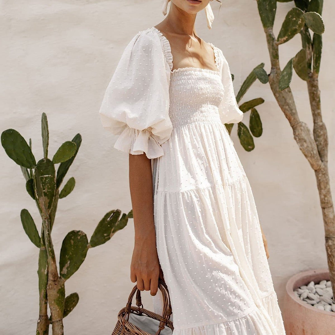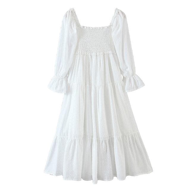 SQUARE NECK RUFFLE MIDI DRESS: This is made of Cotton. This midi dress features Square Collar, Puff Sleeve style, Bow decorations, Pullover closure type and Knee dress length. Shop now at Boho Chic Clothing.